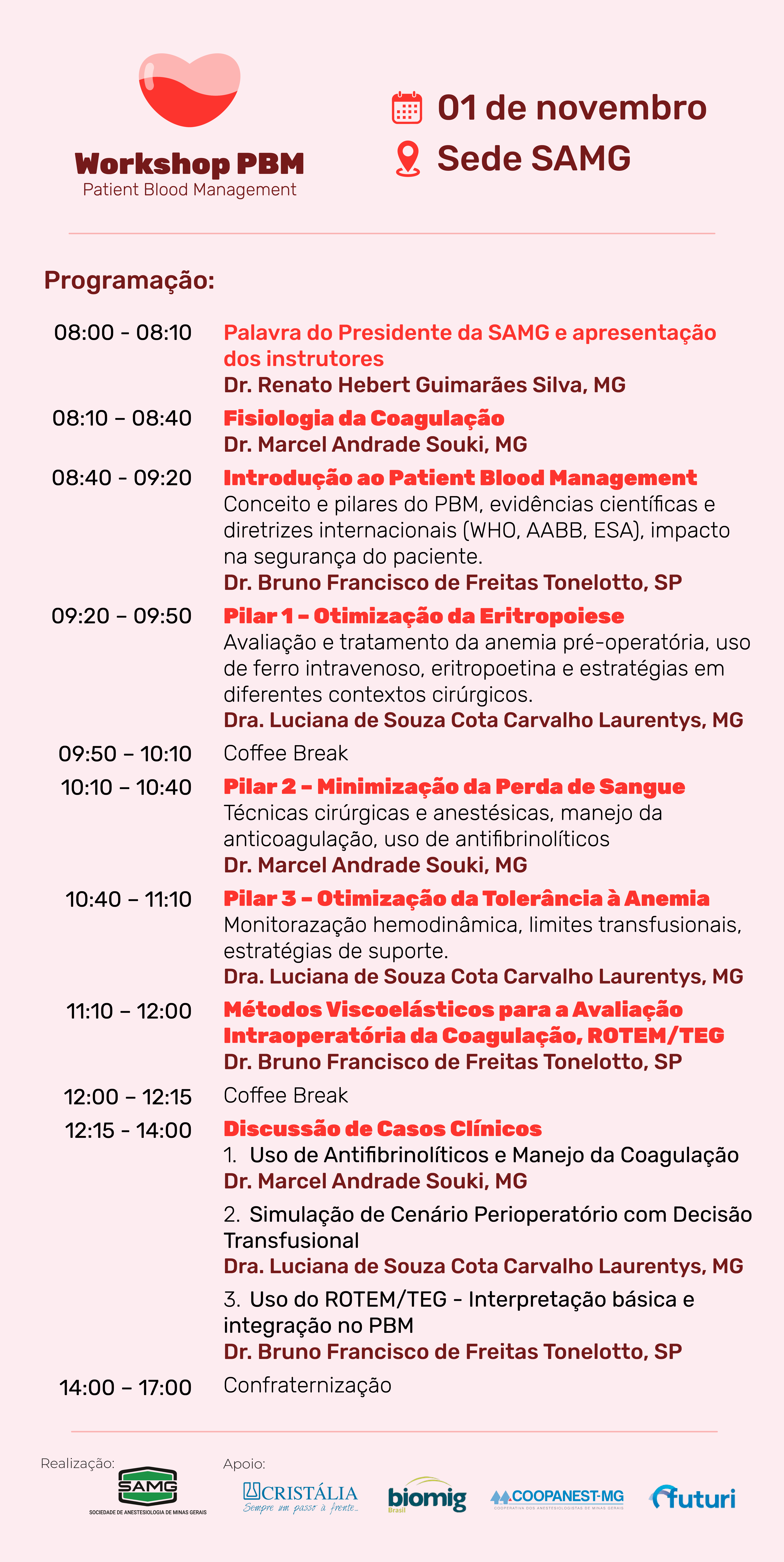 O objective do workshop é capacitar os participantes nos princípios do PBM, com foco em estratégias para otimizar a gestão do sangue do paciente, reduzir transfusões desnecessárias e melhorar desfechos clínicos.