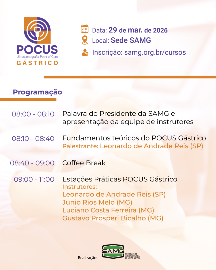 Pensando nessa realidade crescente, a Sociedade de Anestesiologia de Minas Gerais (SAMG) promove o Curso POCUS Gástrico, um treinamento voltado para quem deseja incorporar a ultrassonografia à prática diária e ampliar o raciocínio clínico no manejo do risco de broncoaspiração.